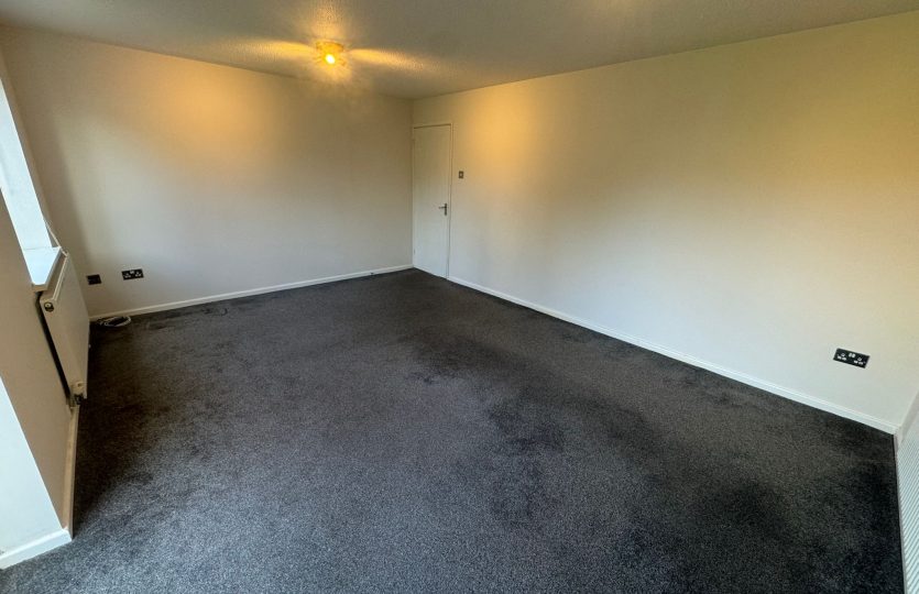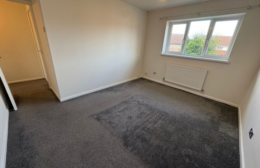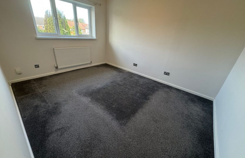 Grey carpet, PVC double-glazed window, single fin radiator, chrome sockets and switch, light pendant, and door stopper.