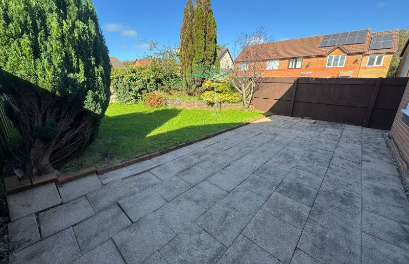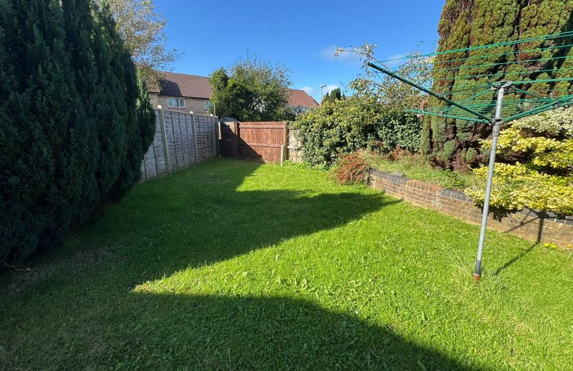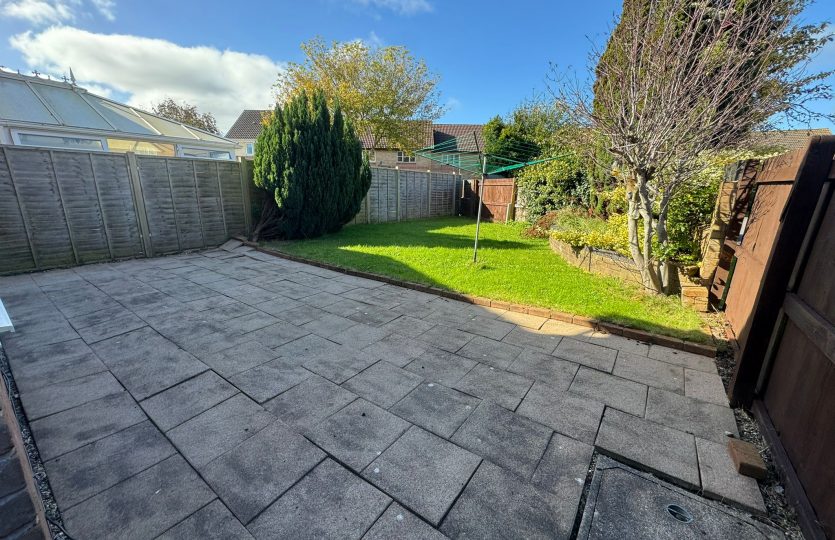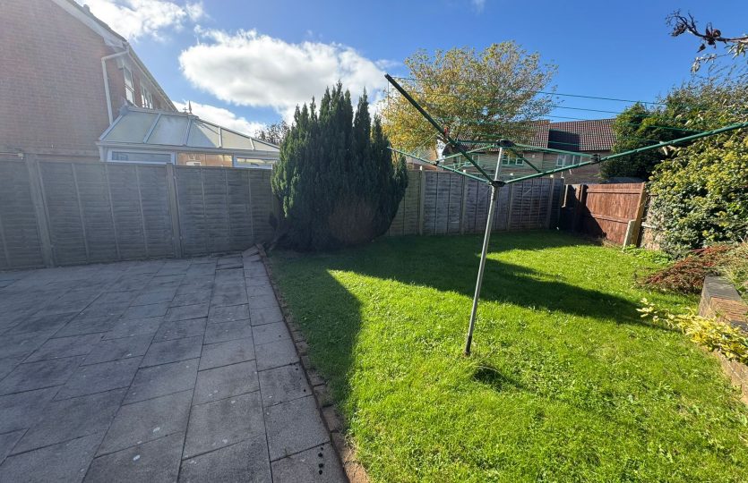 Private rear garden with paved patio, lawned area, clothes line, and side gate access.