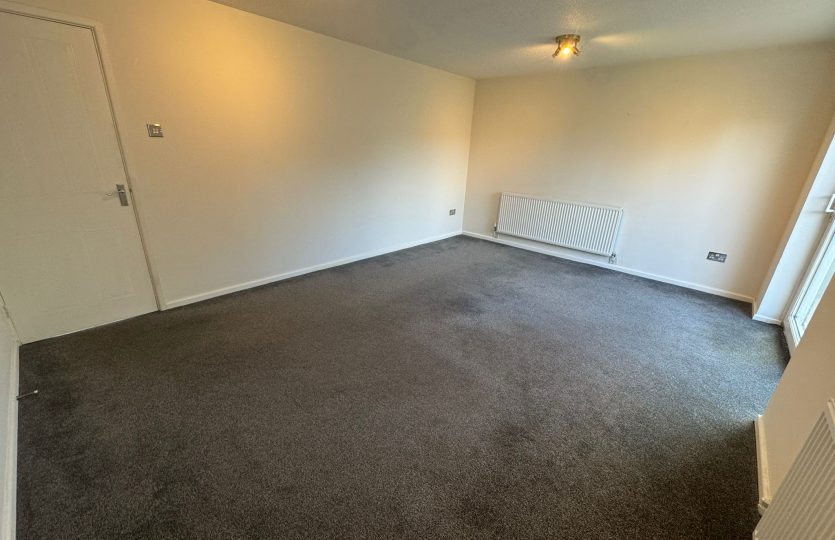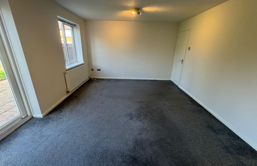 Spacious and bright with sliding PVC patio doors, grey carpet, double-glazed window with vertical blinds, two large single fin radiators, three double chrome sockets, aerial and Virgin TV points, and two modern LED chrome lights.