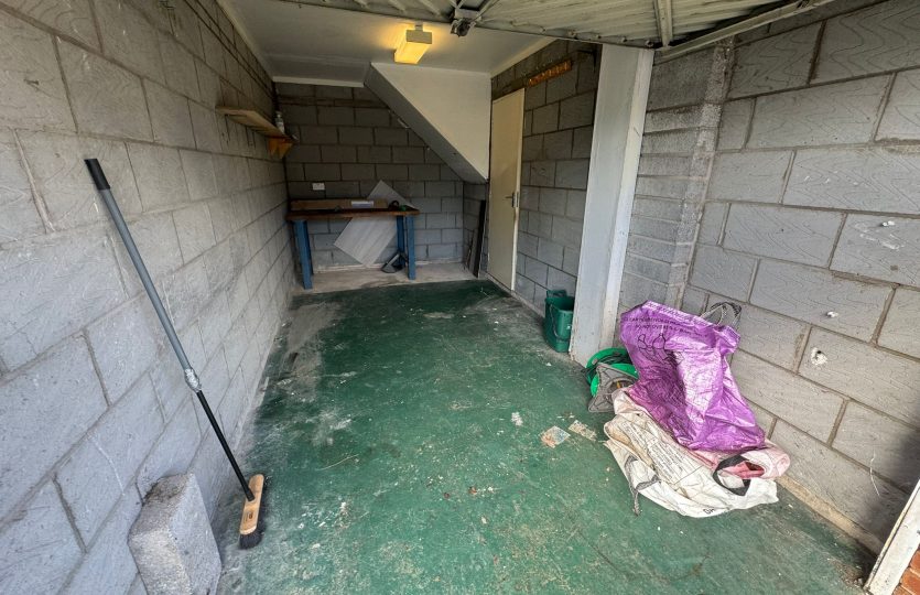 Grey carpet, PVC front door, single socket, three-way switch, smoke alarm, fuse board, single fin radiator, storage cupboard, and access to integral garage.