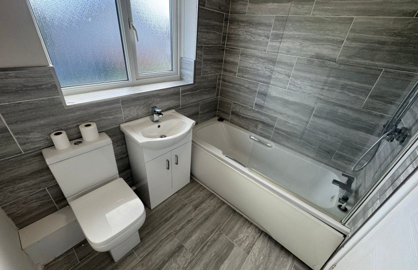 Stylish and modern with chrome towel rail radiator, tiled floor, ¾ tiled walls, misted double-glazed window, pull cord switch, IP-rated light, vanity unit, bath with shower mixer tap, and WC.